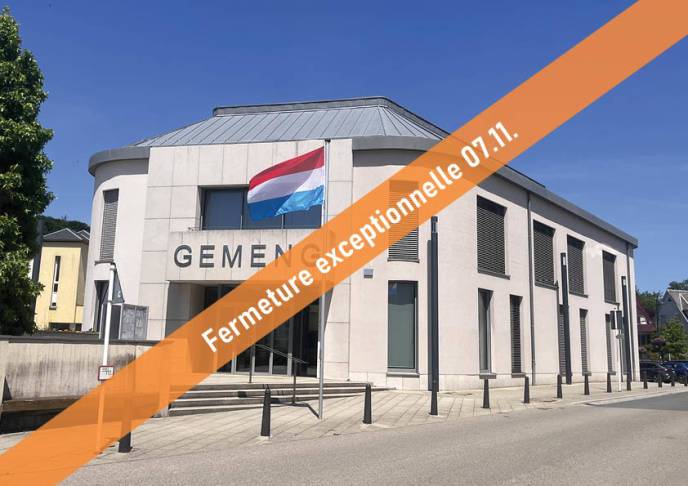 Fermeture exceptionnelle de la Mairie - 07.11.2025 La maison communale sera exceptionnellement fermée le 7 novembre en raison des travaux. Les services resteront joignables par téléphone et par courriel.