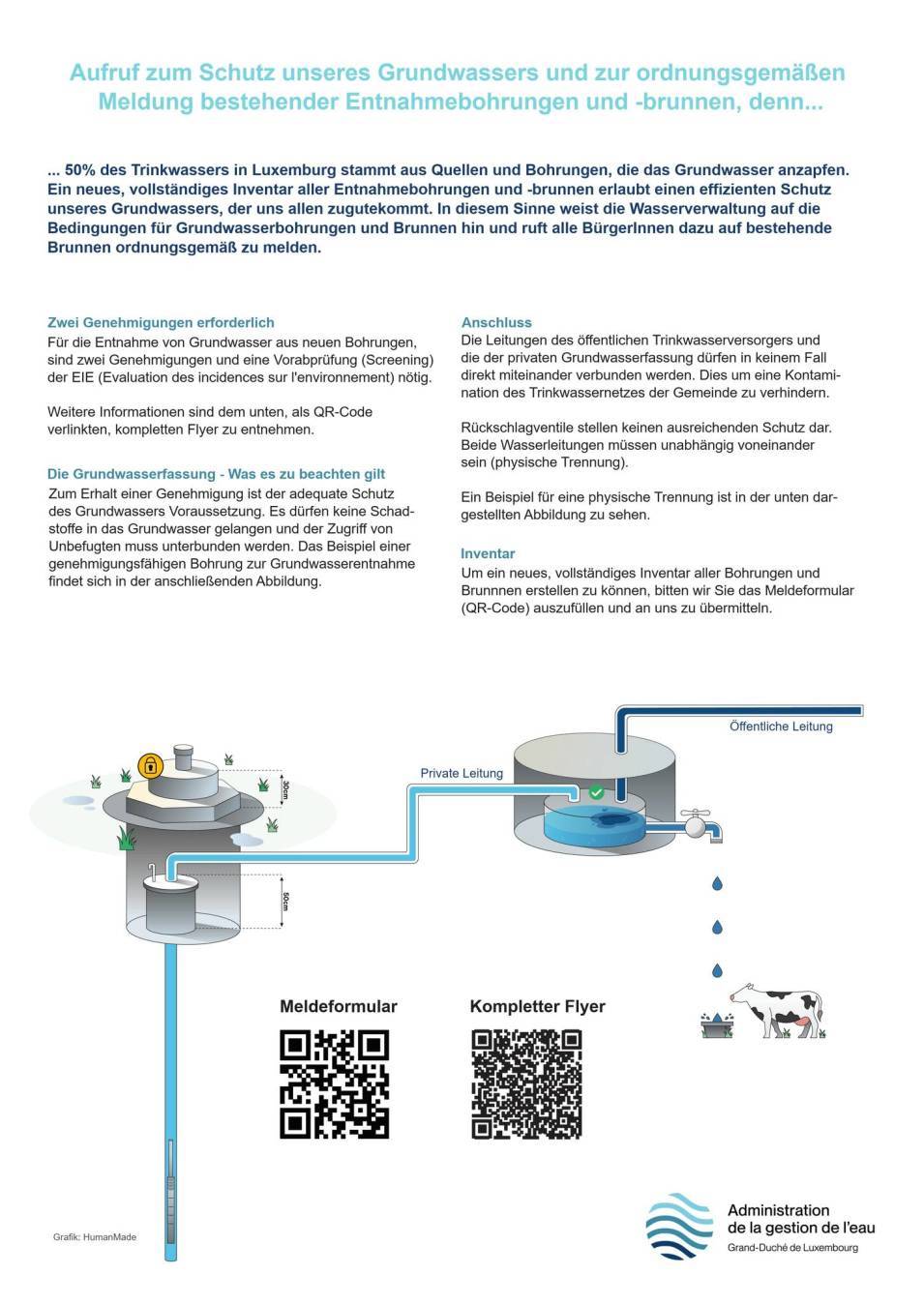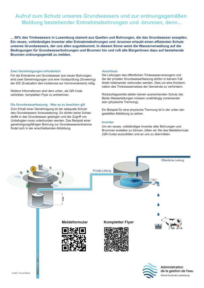 L’Administration de la gestion de l’eau fait l’inventaire des puits et forages privés souterrain dans le cadre du suivi et du maintien du bon état quantitatif des eaux souterraines au Luxembourg.
