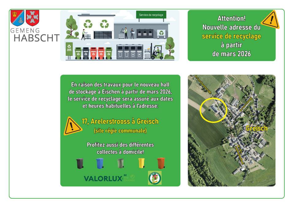 Nouvelle adresse du service de recyclage à partir de mars 2026: 17, Arelerstrooss à Greisch (site régie communale)