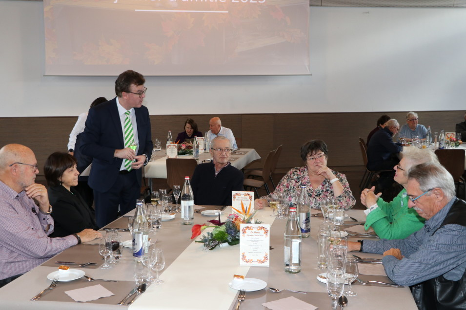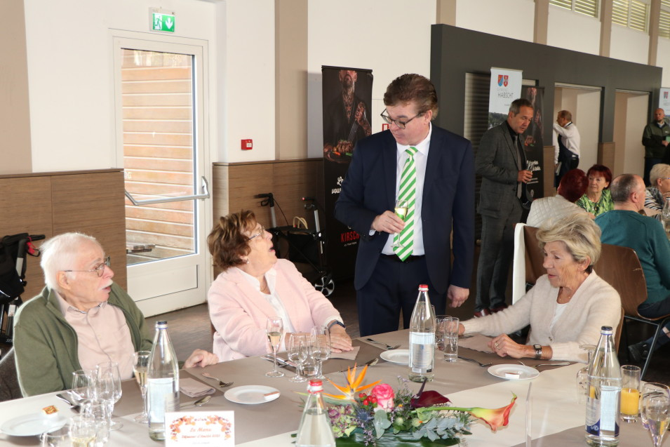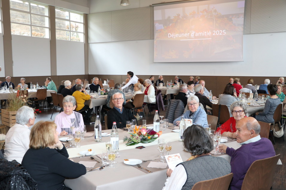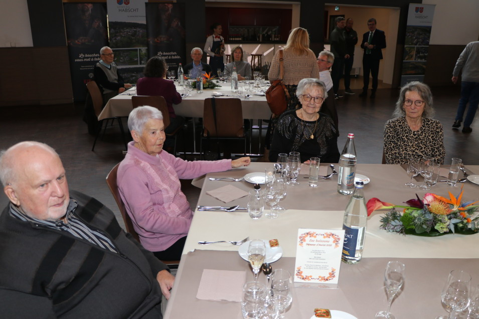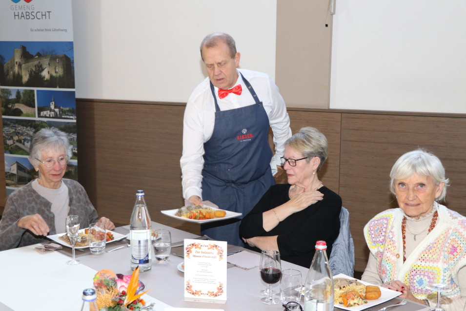 Cette année, le déjeuner d'amitié traditionnel de la commune de Habscht qui s’adresse à nos habitants à partir de 70 ans a eu lieu les 20 et 21 novembre au Centre polyvalent à Hobscheid; 110 personnes étaient présentes le jeudi, et 80 le vendredi. Gino Tricarico a assuré l'animation musicale pendant ces deux jours avec des mélodies appropriées. Sarah Zwick et Melanie Hilbert du Treff Aal Schoul ont présenté les activités de la Maison des générations à l'aide d'un court film. Dans le cadre du déjeuner d'amitié, Mark Monville, directeur du CIPA Eischen, a invité toutes les personnes intéressées aux journées portes ouvertes du nouveau bâtiment les 17 et 18 janvier 2026.