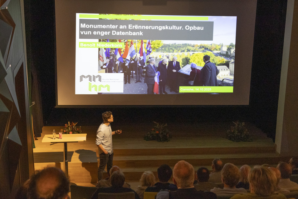 Mëttwochs hunn de Luc an Olivier Nilles a Begleedung vum Katrin Reifenrath ee Concert mat Lidder a Gedichter am Gedenken un d’„Tambower Jongen“ an der Salle Union ginn. Den Ofschloss war den 13. November eng Konferenz vum Benoît Niederkorn, Direkter vum Dikrecher Militärmusée, iwwert d’Monumenter an d’Erënnerungskultur un den Zweete Weltkrich am Lëtzebuerger Land.